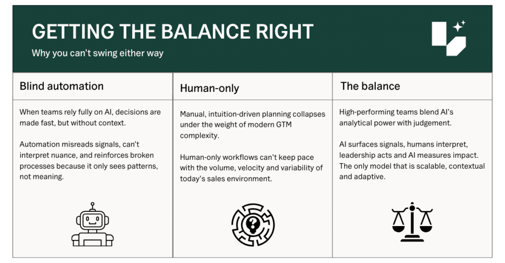 We’ve all seen the two extremes. On one side, blind automation, where formerly headstrong financial experts now rely solely on the algorithm. This delegation fails because technology cannot interpret the critical context or human nuance behind a sales performance signal. On the other hand, the human-Only approach simply cannot keep pace. Planning based purely on intuition and manual data processing is instantly overwhelmed by the sheer volume, velocity and variability of today’s Go-To-Market environment.